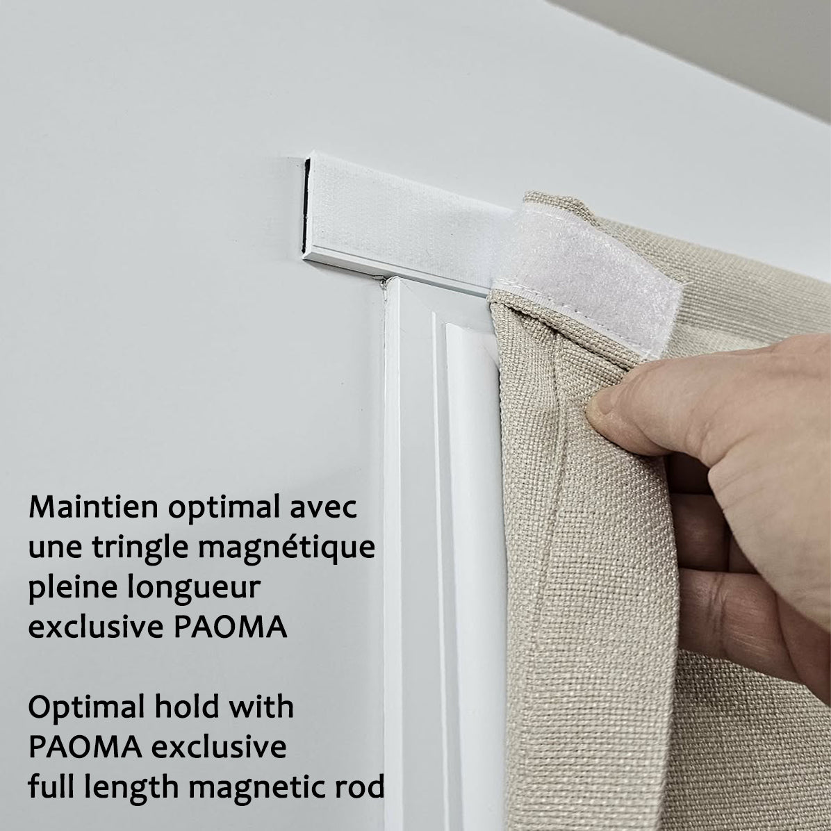 Le panneau s’installe sur la porte à l’aide d’une tringle magnétique plate avec velcro incluse. Le store est pourvu d’un velcro souple cousu à l’arrière.